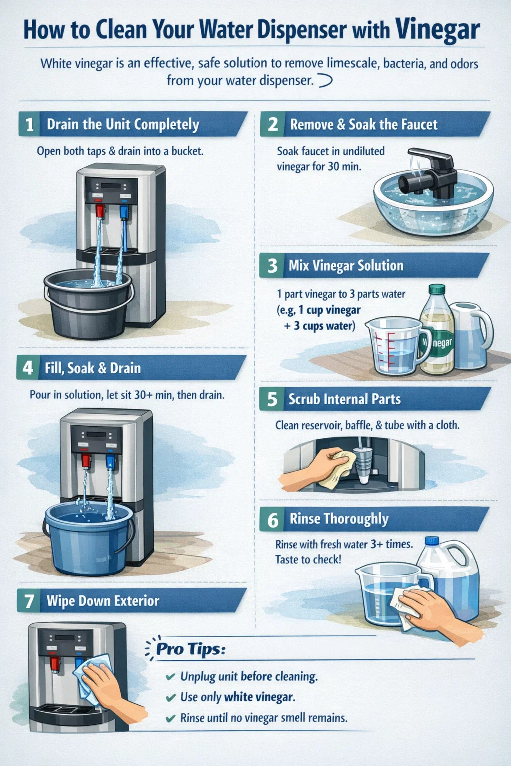 W tym przewodniku szczegółowo omówiono każdy etap procesu — od tego, jakiego stężenia użyć, przez czas moczenia, po części, które większość ludzi zapomina wyczyścić. Niezależnie od tego, czy masz chłodziarkę nablatową zasilaną butelką, jednostkę ładowaną od dołu, czy dozownik w miejscu użycia podłączony do instalacji wodno-kanalizacyjnej, obowiązuje metoda podstawowa.
