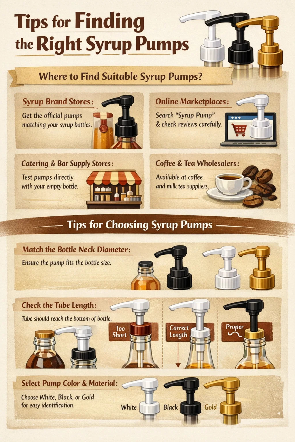 Jeśli szukasz odpowiednich pompek do syropu, ale martwisz się, że dobierzesz niewłaściwy rozmiar, oto kilka wskazówek, jak je znaleźć i typowe metody zakupów: