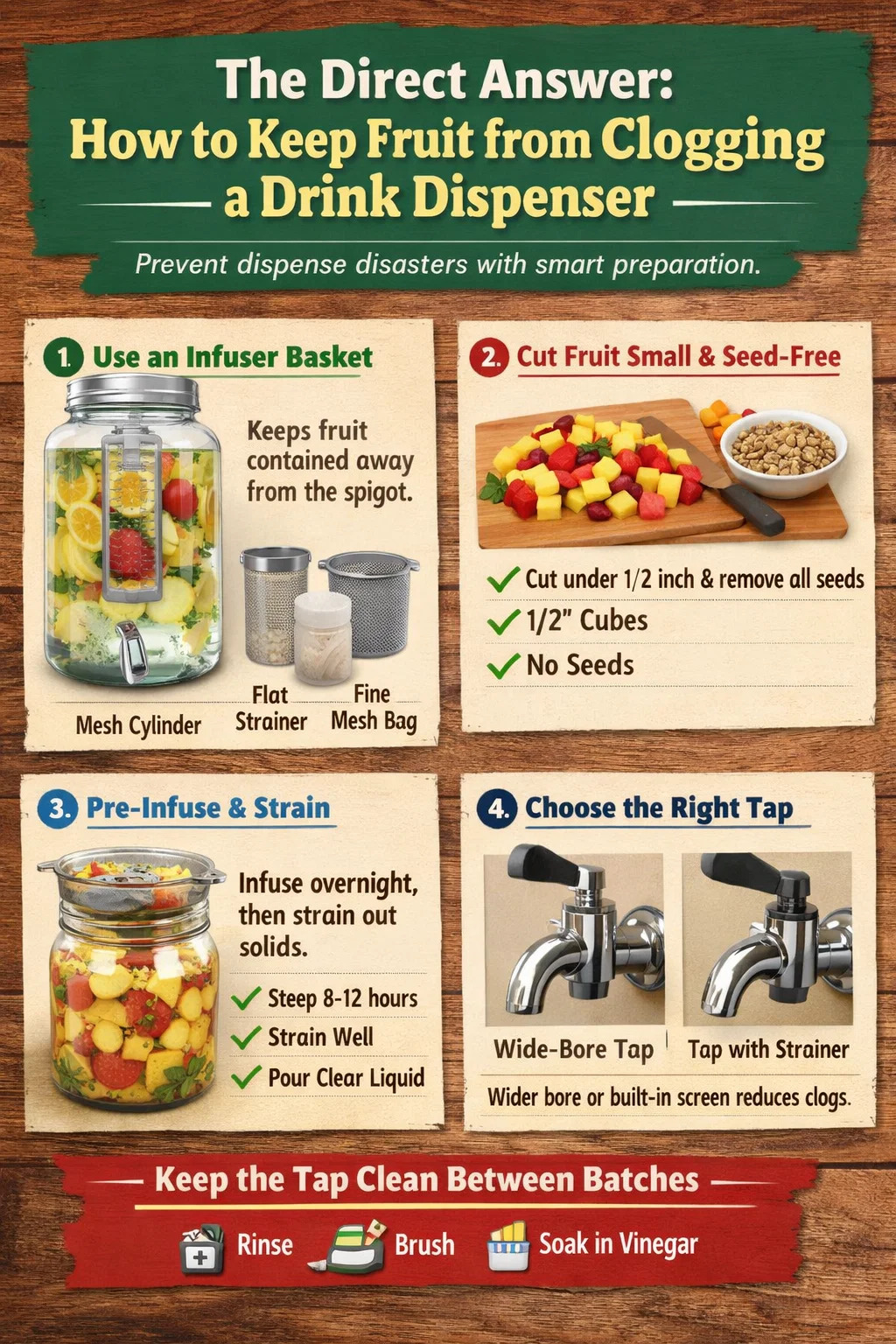 Jeden często pomijany krok: zawsze usuń nasiona przed dodaniem owoców cytrusowych lub pestkowych . Pojedyncze nasionko cytryny umieszczone w metalowym kranie dystrybutora napoju może zmniejszyć wypływ do strużki w mniej niż pięć minut użytkowania.