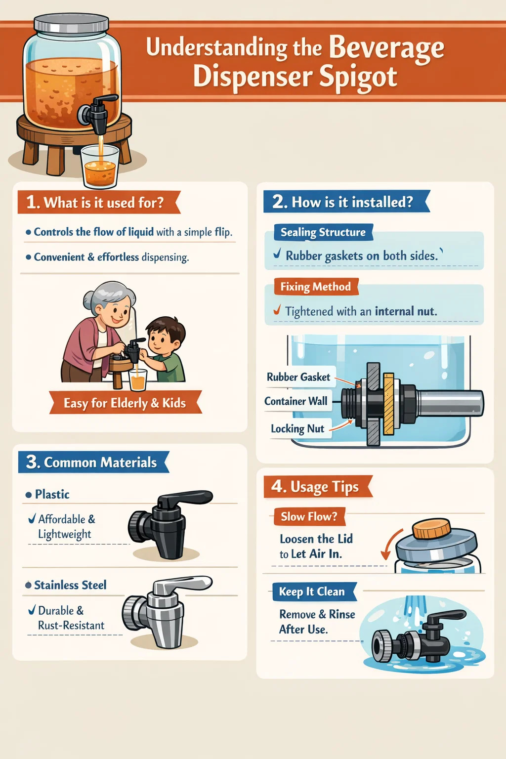 Sposób mocowania: Duża nakrętka po wewnętrznej stronie blokuje cały kran dozownika napoju na pojemniku, zapewniając, że sok lub woda nie wyciekną przez szczeliny.