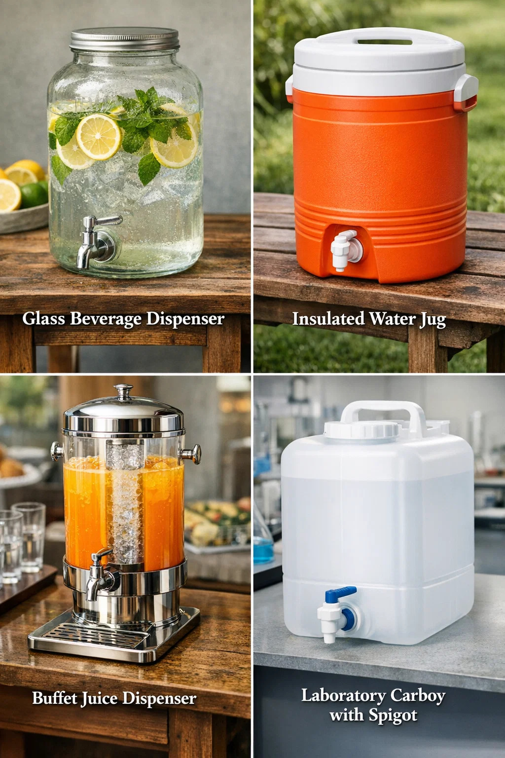 Ten rodzaj pojemnika na napoje z kranem (kran/kran) ma w życiu codziennym wiele różnych nazw, w zależności od jego kształtu, materiału i kontekstu, w jakim jest używany.